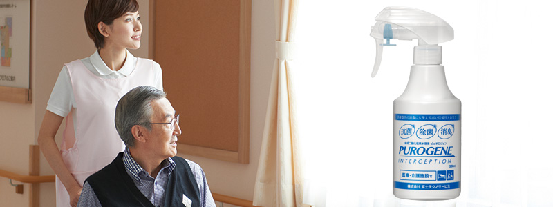 介護・福祉の現場では、高いレベルの衛生管理と安全性を同時に求められています。そして施設が抱える大きな課題が、臭いです。多くの人が生活する場でもある施設内には様々な臭いの原因となる物質、それらを生み出す細菌が存在します。 ピュオロジェン・インターセプションは細菌やウイルスを効果的に除菌することが出来る水成二酸化塩素スプレーです。施設内の衛生環境を改善すると同時に、それらの菌が生み出す悪臭を元から断つことが出来ます。また、臭いの原因物質自体を分解除去する効果もあります。